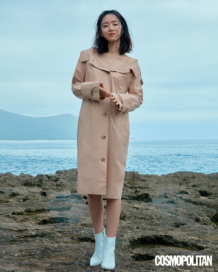 여성스러운 디자인으로 변형된 트렌치코트는 그녀처럼 드레스로 연출해도 그만이다.