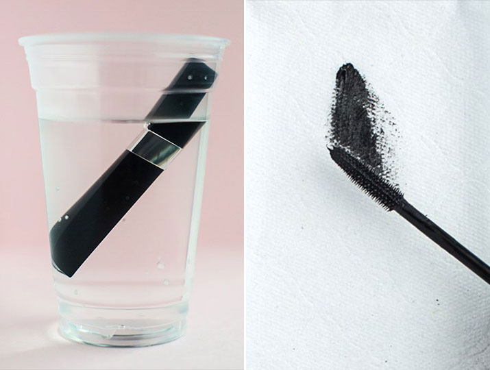 개봉한지 오래됐거나 액이 굳어 잘 뭉치는 마스카라는 바르기 전 미지근한 물에 몇 분 담가두자. 그래도 뭉친 덩어리가 생길 수 있으니 속눈썹에 대기 전 휴지(가능하다면 먼지가 묻지 않는 키친타월 추천!)에 한번 쓸어내자.