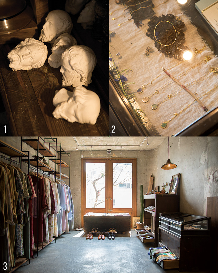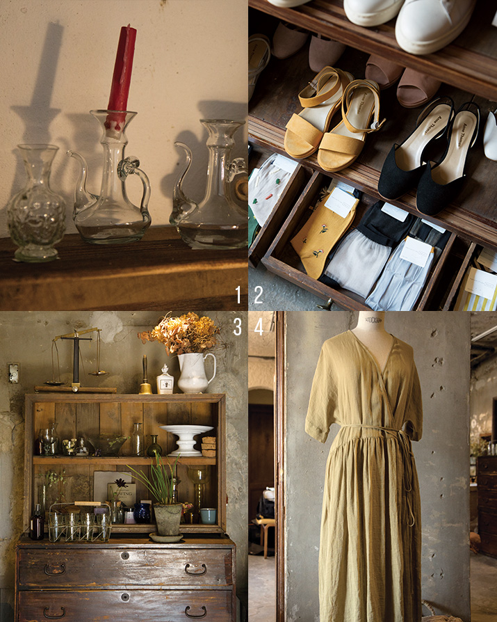 리넨 소재의 옷과 밀짚 소재의 액세서리, 오래된 가구들이 공간과 잘 어울린다.