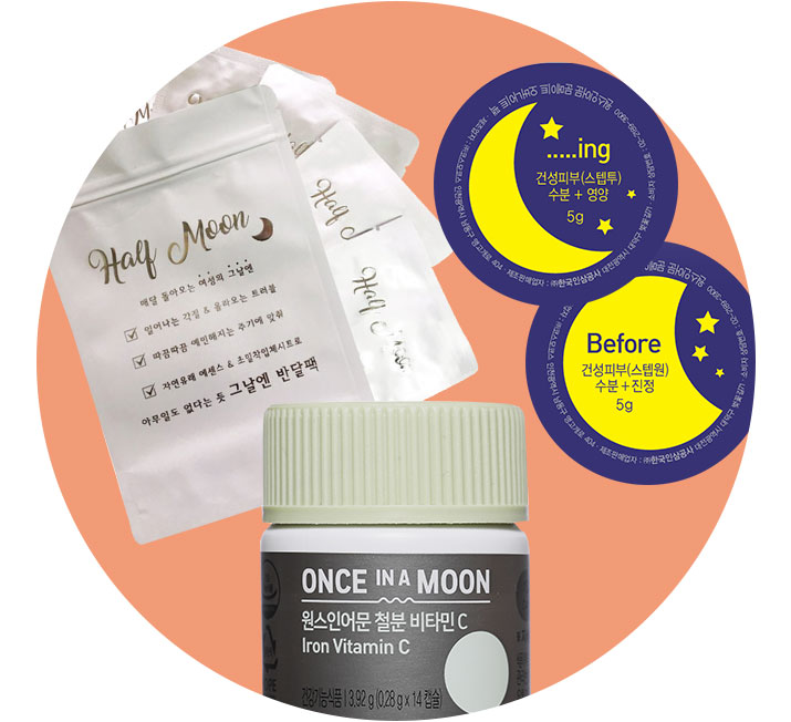 (왼쪽부터) 그날엔 반달팩by슈퍼샤이니스킨 1만원, 철분비타민C 6천5백원, 원스인어문 문메이트 오버나이트팩(건성 피부) 1만2천원