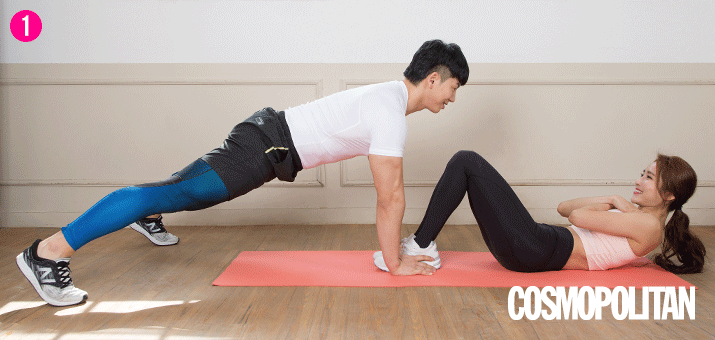 1 남자는 풀 플랭크 자세를 취하고, 여자는 두 손을 가슴 앞으로 교차해 무릎을 세워 눕는다. 이때 남자는 두 손으로 여자의 발을 눌러 고정한다.