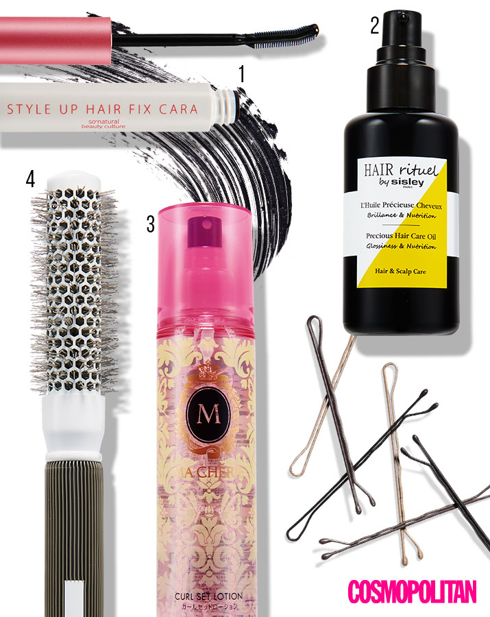 1 쏘내추럴 스타일 업 헤어 픽스 카라 1만5백원. 2 시슬리 프리셔스 헤어 케어 오일 10만원대. 3 마쉐리 컬 셋 로션 EX 1만3천원대. 4 올리브영 핫컬링 브러쉬 1만2천원.