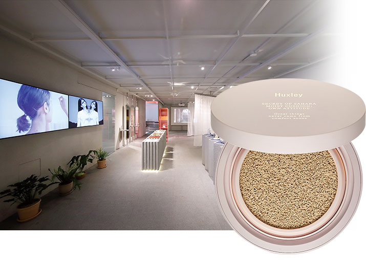 메인 원료 원산지인 모로코 사하라사막을 체험할 수 있는 인테리어가 특징. 브랜드 아이덴티티, 제품에 함유된 성분, 시그너처 향을 확인할 수 있다.