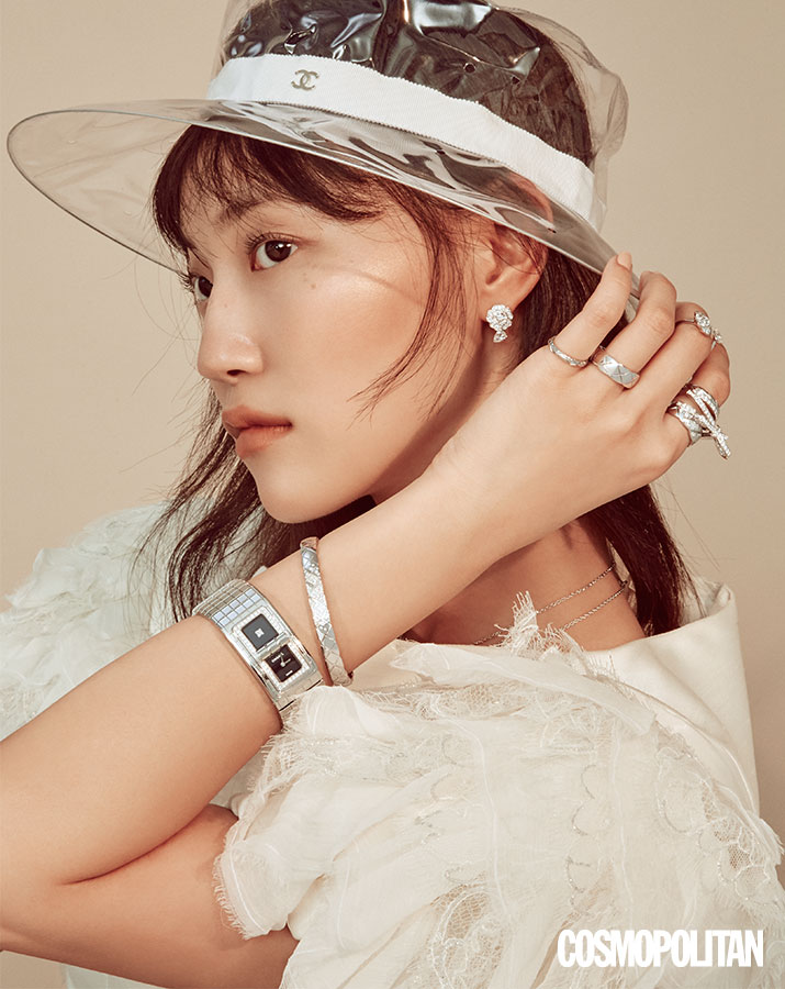 드레스 2천8백29만원, 모자 1백43만원 모두 샤넬. 귀고리, 목걸이, 뱅글, 반지 모두 가격미정 샤넬 화인 주얼리. 시계 가격미정 샤넬 워치.