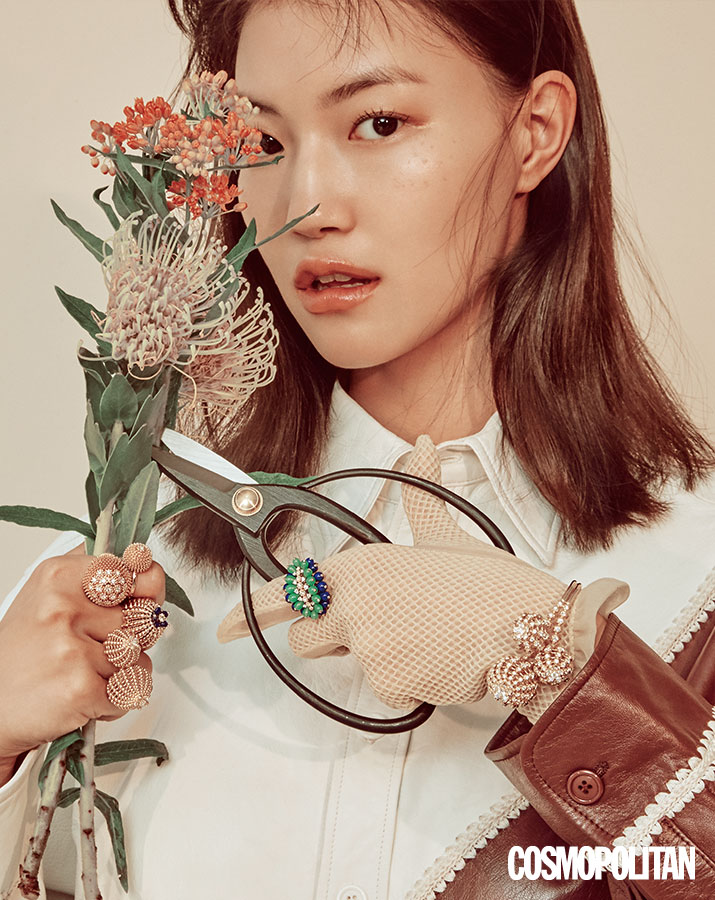 가죽 셔츠 가격미정 셀린느. 장갑 가격미정 벨앤누보. 팔찌 가격미정, 반지 (오른손 위부터)5백30만원대, 1천8백만원대, 가격미정, 가격미정, (왼손)가격미정 모두 까르띠에.