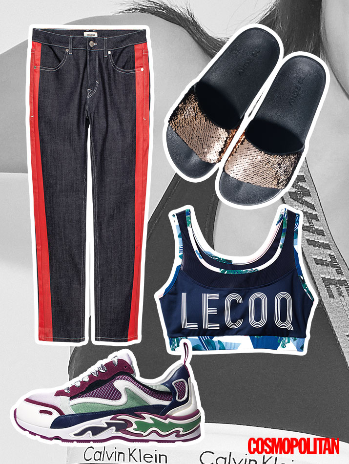 브라톱 6만9천원 르꼬끄 스포르티브. 팬츠 49만9천원 쟈딕앤볼테르. 슈즈 4만8천원 작시 by 앳코너. 운동화 30만원대 산드로.