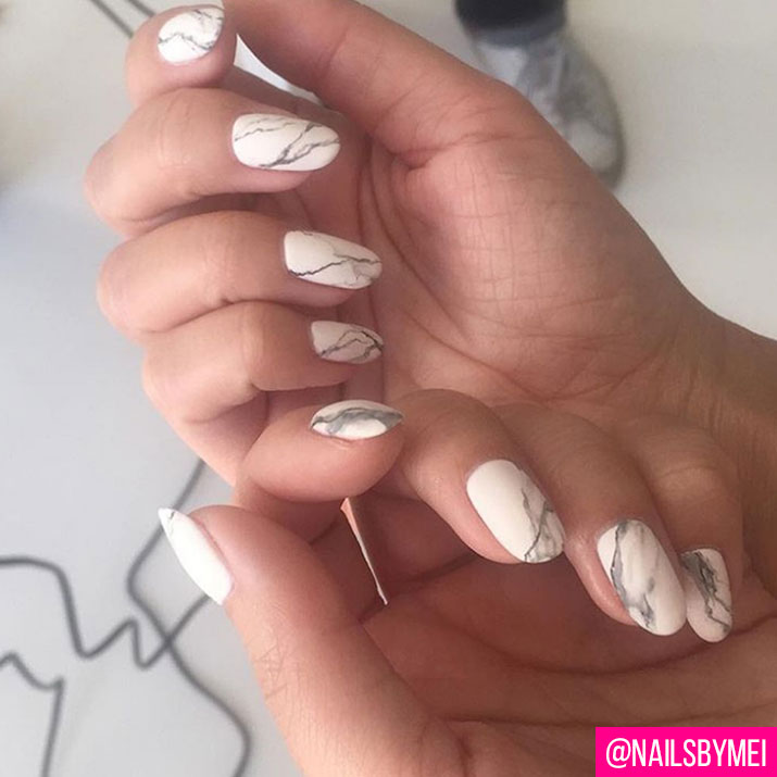 요즘 빼놓을 수 없는 패턴 네일의 강자, 대리석 네일도 매트 텍스처와 함께라면 색다른 느낌이 들 것. 특히 세로 길이가 긴 네일 보디에 잘 어울린다.