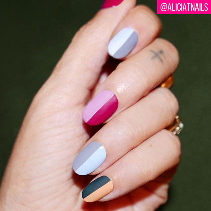 다양한 컬러를 손톱 중앙선 기준 딱 반으로! 나눠 칠해보자. 보색 또는 톤온톤의 컬러 모두 잘 어울리니 그간 시도해보지 못했던 컬러들을 도전하기 딱인 디자인일 듯.