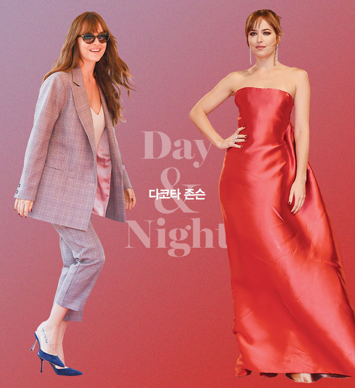 디올 쿠튀르 컬렉션의 레드 드레스를 입고 레드 카펫에 오른 그녀. 낮엔 낙낙한 체크 슈트를 입어 180도 다른 모습을 선보였다.