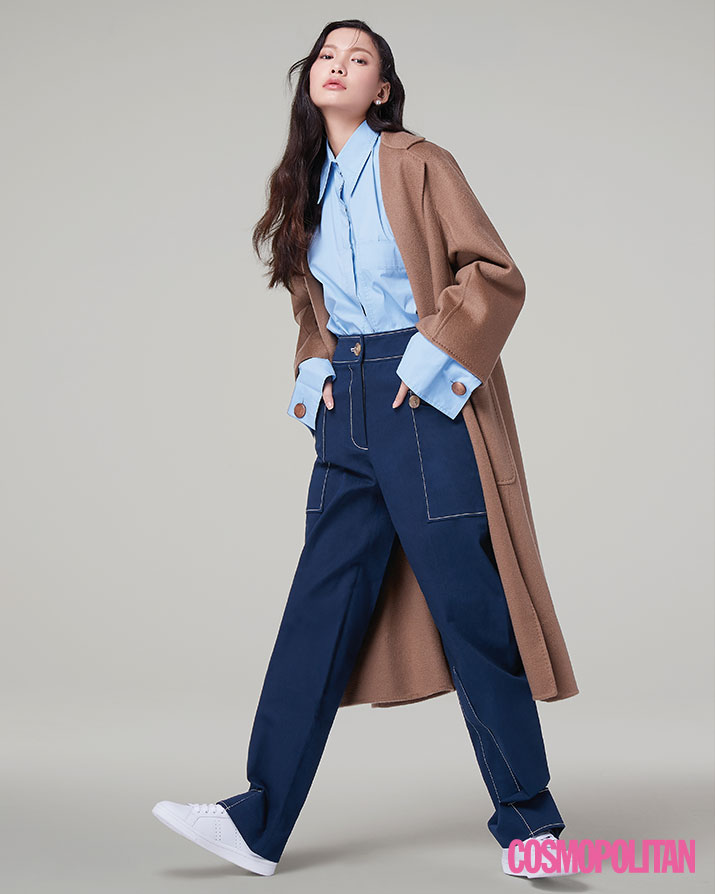 코트 7백68만원 막스마라. 셔츠 60만2천원, 데님 팬츠 가격미정 모두 레지나 표. 스니커즈 13만8천원 프레드페리.