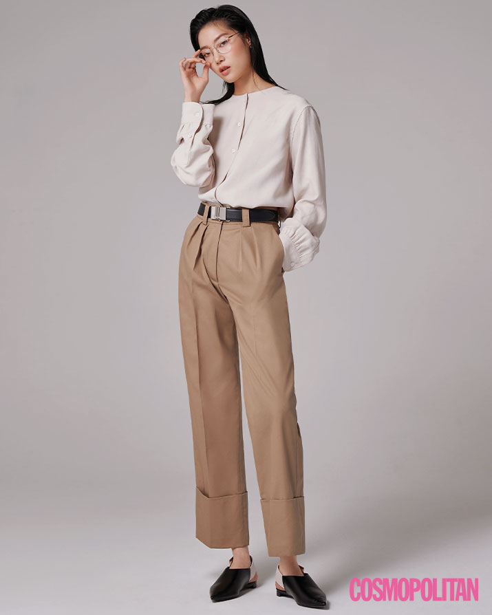 셔츠 19만9천원 그레이양. 팬츠 51만4천원 MSGM by ihanstyle.com. 벨트 가격미정 미우미우. 안경 23만8천원 스틸러. 슬링백 슈즈 가격미정 자라.