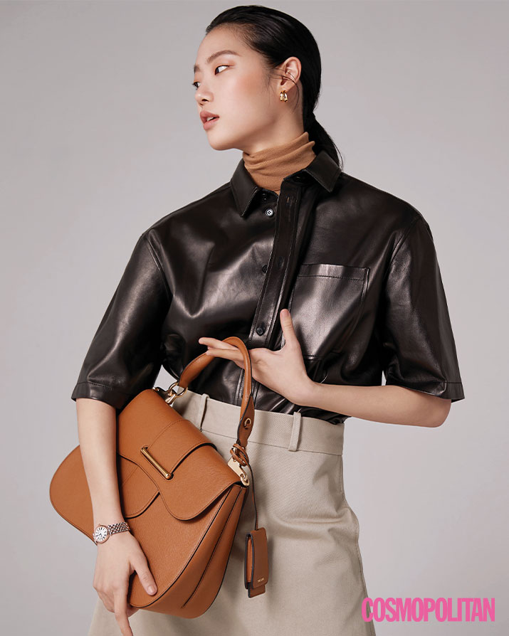 가죽 셔츠 3백47만5천원, 스커트 1백14만원 모두 보테가 베네타. 터틀넥 톱 3백57만원, 톱 핸들 백 4백87만원 모두 프라다. 귀고리 7만8천원 에스실. 시계 1백60만원대 프레드릭 콘스탄트.