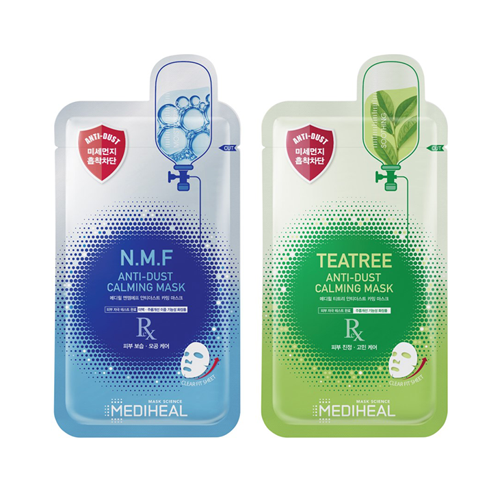 메디힐 N.M.F 안티더스트 카밍 마스크 & 티트리 안티더스트 카밍 마스크 편백수, 하이드로제네이티드레시틴, 세라마이드3등의 성분이 복합된 프로테션-P(E) 콤플렉스가 미세먼지 흡착을 방지한다. 대나무 원사를 사용한 시트가 피부에 얇게 밀착돼 유효 성분의 흡수를 돕는다. 각각 27ml 3천원, 24ml 2천원.