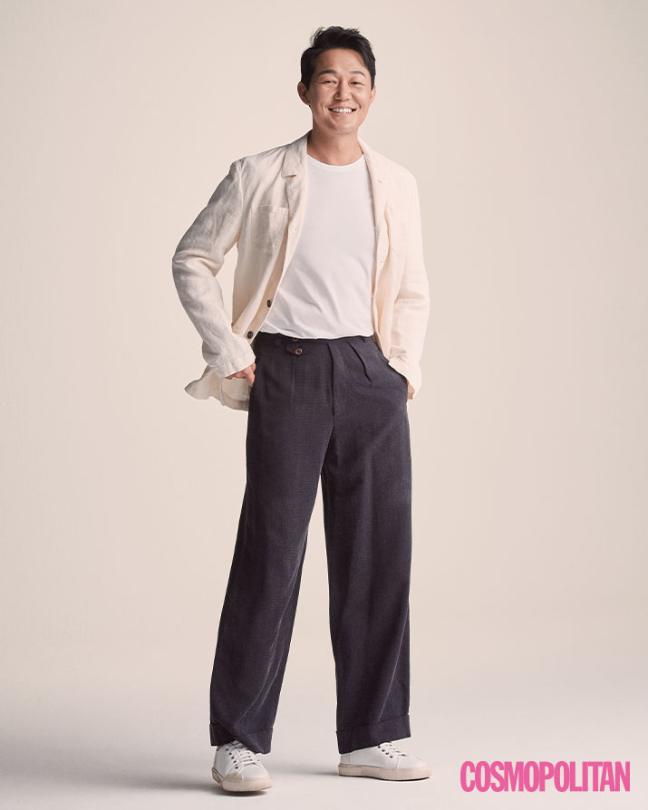 재킷 75만원 마시모알바 by 아티지. 팬츠 가격미정 조르지오 아르마니. 스니커즈 가격미정 발리. 티셔츠 스타일리스트 소장품.