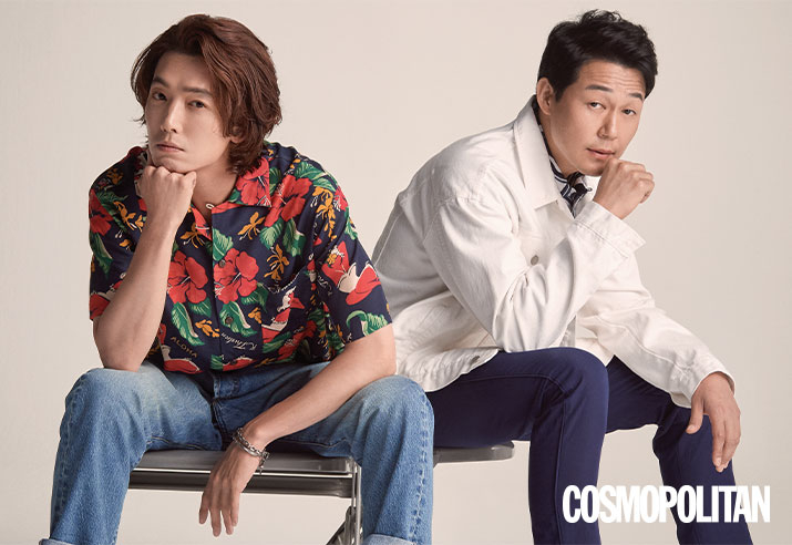 (정경호)셔츠 61만5천원, 데님 팬츠 69만5천원 모두 R13 by 톰그레이하운드. 체인 팔찌 27만8천원, 기본 팔찌 23만원 모두 하이치. (박성웅)셔츠 14만8천원 클럽모나코. 팬츠 가격미정 코스. 데님 재킷 스타일리스트 소장품.