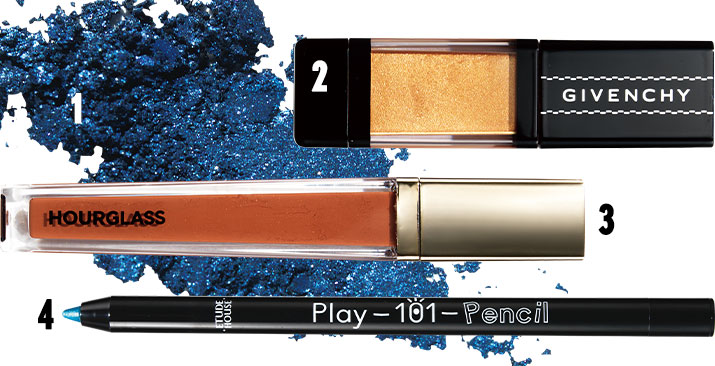 1 메이크업 포에버 아티스트 컬러 섀도우 #D222 나이트블루 3만2천원대. 2 지방시 옴브르 앵떼르디뜨 N04 골드 스피리트 4만6천원. 3 아워글라스 언리얼 하이 샤인 볼류마이징 립 글로스 스트라이크 3만9천원. 4 에뛰드하우스 플레이 101 펜슬 #25 6천5백원.