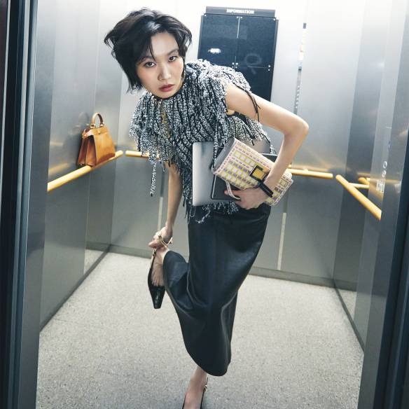 레이스 드레스 가격미정, 셔츠 1백10만원대, 브리프 가격미정, 토트백 1백90만원대 모두 프라다. 헤어밴드 1만9천원 자라. 팔찌 58만원 타니 by 미네타니.