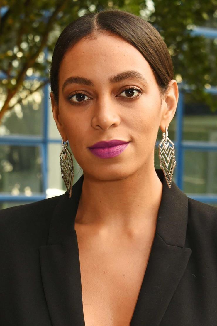 솔란지의 재미있고 볼드한 퍼플 립 컬러만 있으면 다른 어떤 것도 추가로 더할 필요가 없다. 아름답게 결을 살린 브로우만 제외하고!