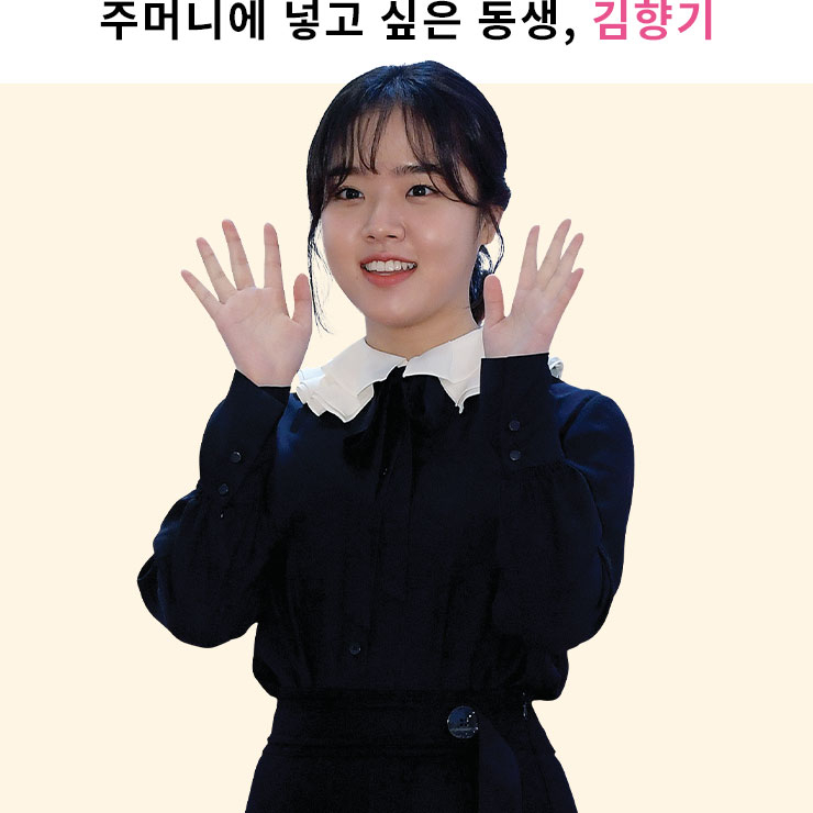 어렸을 땐 동생이 가끔 너무 귀여워 깨물어주고 싶었는데, 지금은 역변해 못생기고 말도 안 들어서 진짜 깨물어 ‘죽이고 싶은’ 생각이 들 때가 있다. 하지만 어릴 적부터 지금까지 ‘정변의 아이콘’인 김향기가 내 동생이라면 20살이라도 2살처럼 귀여워해줄 수 있다. 왠지 말도 잘 들을 것만 같다. 가족이어도 ‘기브 앤드 테이크’인 법. 동생이 말 잘 들으니 나도 동생이 원하는 거라면 뭐든 들어줄 수 있을 것 같다. 작고 소중한 향기, 누가 건드리면 가만두지 않을 언니 역할 준비 완료! - 캥거루언니(30세, 회사원)