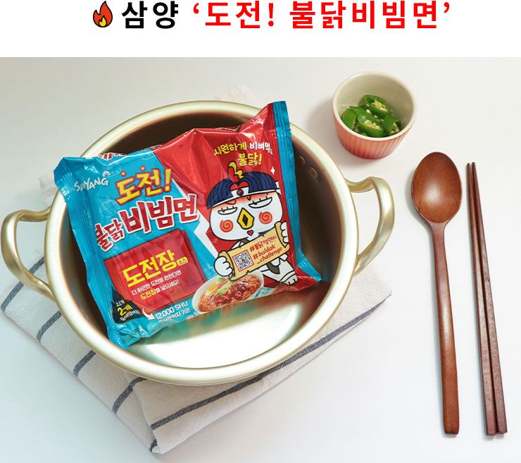 진짜가 나타났다! 무려 스코빌 지수(고추의 매운 정도를 나타내는 척도) 12,000에 해당하는 도전장 소스가 별첨된 또 하나의 불닭 시리즈. 기본 액상소스만 더해 먹으면 크게 맵다는 생각이 들지 않겠지만, 도전장 소스를 넣는 순간 혓바닥을 강타하는 극강의 매운맛을 경험하게 될 거다. 진짜 도전할 각오가 된 이들만 조심스레 챌린지에 참여해보자.