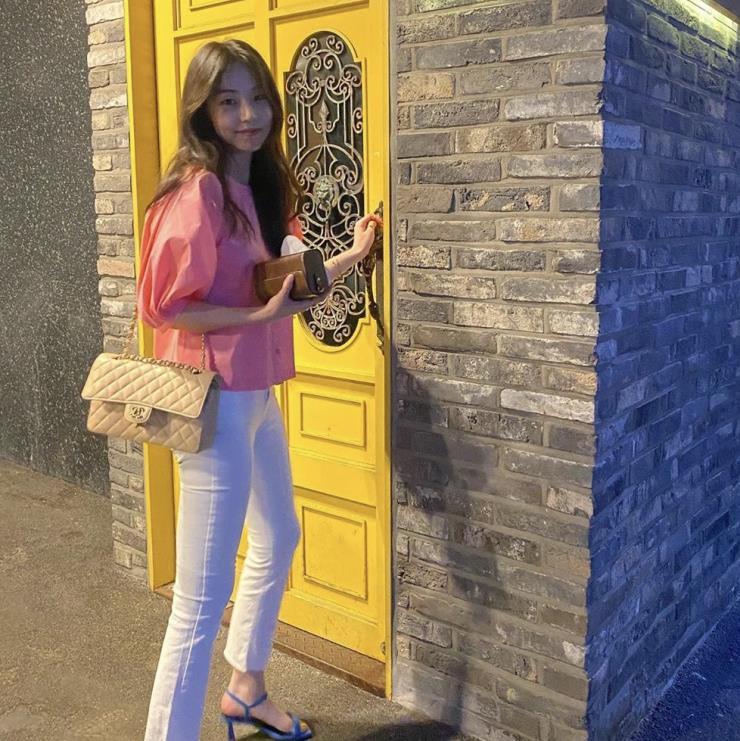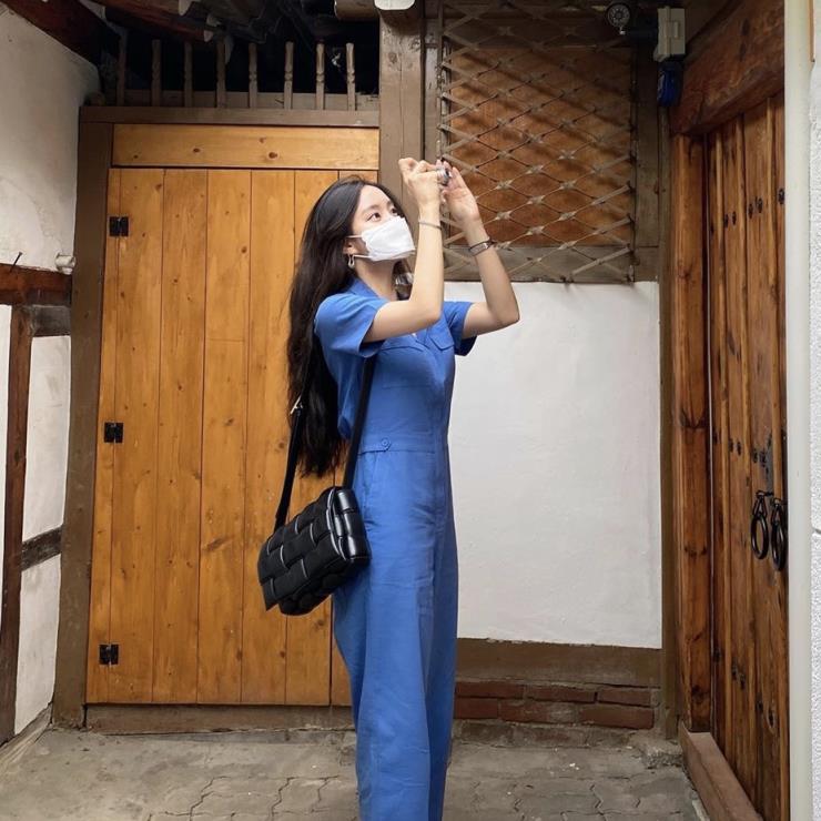 이번 시즌 점프 수트가 다시 핫하지. 효민은 블루컬러 점프 수트에 보테가 베네타의 시그니처 카세트 백을 멨어. 그녀의 초이스는 활용도 높은 블랙 컬러!