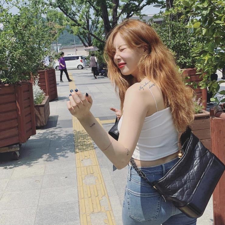여러 스타의 사랑을 받는 아이템인 샤넬 가브리엘 호보. 현아는 청바지에 화이트 톱으로 베이직한 옷차림을 연출하고, 가방을 크로스로 메서 룩에 포인트를 줬어.