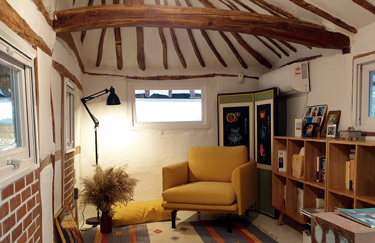 ‘낡다’는 말로는 부족한 폐가를 하나하나 뜯어고치고 자기 취향대로 꾸미는 과정을 몇 개월 동안 지켜봤어요. 지금 어디까지 완성됐나요? 마당만 좀 정리하면 거의 다 끝나요. 본채는 침실·안방 문을 떼고 만든 안 거실, 멍 때리며 바깥 풍경을 볼 수 있는 밖 거실, 목욕탕처럼 조적 욕조를 짜 맞춘 욕실과 화장실, 부엌, 서재로 꾸몄어요. 독채로 난 별채는 글도 쓰고 그림도 그리는 공간으로 쓰려고요.