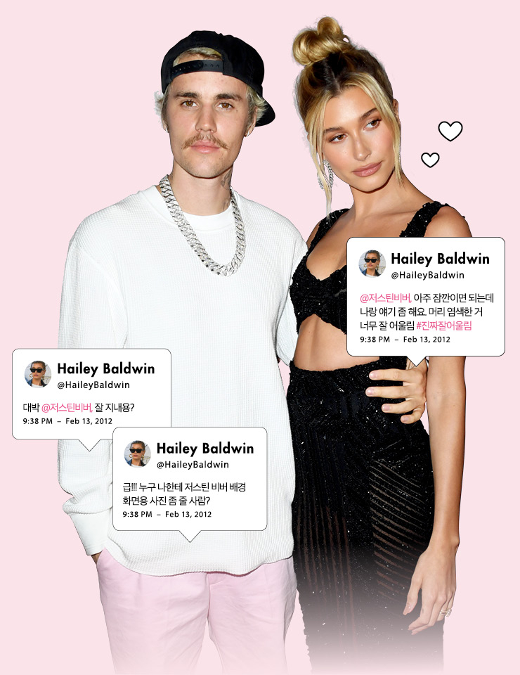 주말이면 맥주 한 캔을 옆에 둔 채 손가락에 묻은 과자 가루를 빨아 먹으며 트위터를 켠다. 그중에서도 가장 재미있는 일은 좋아하는 연예인에게 쪽지 날리기. 어차피 봐도 확인하지 않을 테니 마치 일기 쓰듯이 아무 말을 끄적거린다. 놀라운 사실은 헤일리 비버도 그중 하나였다는 것. 그녀는 2011년부터 저스틴 비버를 향해 꾸준히 트윗을 날렸다. ‘존버’는 승리한다고 했던가, 불가능할 거 같던 오랜 팬심의 결과를 보라. 결혼에 골인한 그녀를 보니 존경심마저 생긴다. 헤일리 비버 & 저스틴 비버