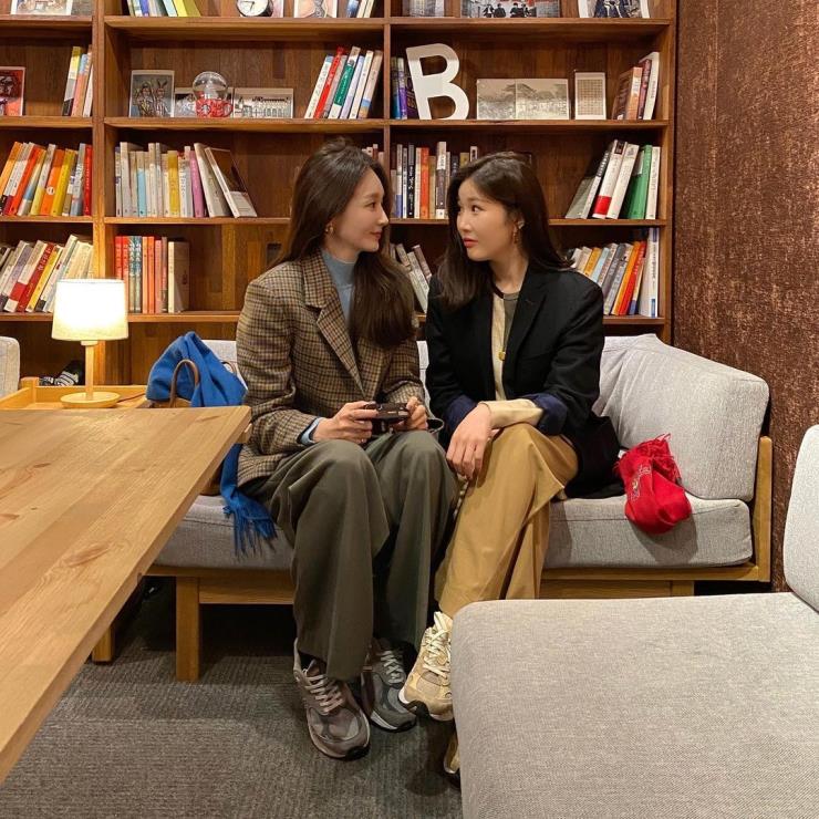 나란히 뉴발란스 운동화를 신은 다비치. 강민경은 뉴발란스 990 그레이컬러를 픽했고, 이해리는 992 탄 컬러를 신었다.