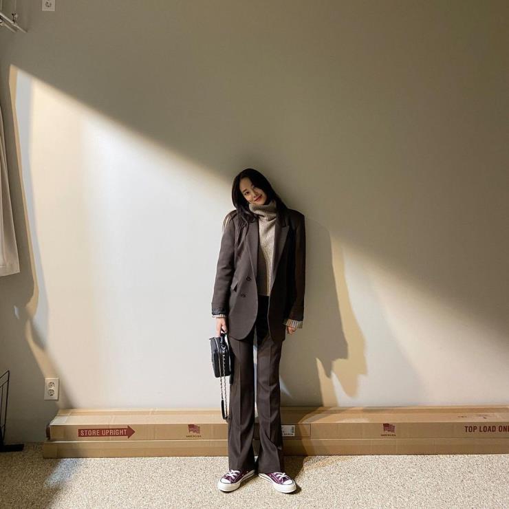 퍼플 컬러의 컨버스가 그녀의 짙은 브라운 수트와 찰떡이다. 흰색, 검정색 운동화가 지겹다면 컨버스로 컬러 포인트를 줘보자.