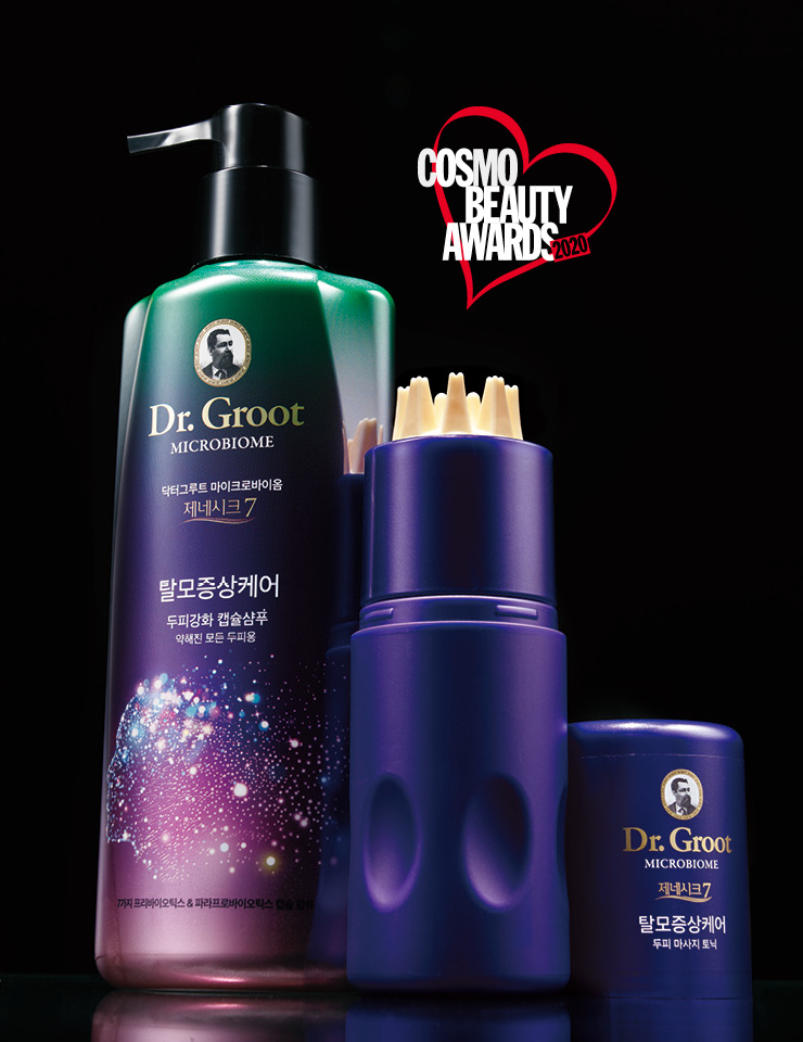 대학에서는 주니어, 회사에서는 겨우 주임 직급을 달았을 연차. 닥터그루트가 세상에 나온 지는 이제 고작 3년 남짓 됐다. 그럼에도 괄목할 만한 성과를 차례로 이루어내며 새로운 역사를 써내려가는 중이다. 경쟁이 심한 탈모 샴푸 시장에서 평균 샴푸 가격 대비 5배 이상 높은 가격에도 불구하고 시장 점유율 1위는 물론, 재구매율 1위를 차지하는가 하면, 최근에는 론칭 3년 만에 누적 판매량 1천만 개를 돌파했다. 그리고 마침내 2020년 연말, 코스모 뷰티 어워즈에서 베스트 두피 케어 제품으로 선정되며 멈출 줄 모르는 레이싱 기록에 방점을 찍었다. 두피 마사저 일체형 용기로 집에서도 전문 클리닉의 두피 케어 효과를 느낄 수 있도록 만든 화제의 아이템, 마이크로바이옴 제네시크7 두피 마사지 토닉이 바로 그 일등 공신. 7가지 프리&파라프로바이오틱스 성분이 함유돼 단 2주 만에 무너진 두피 생태계를 개선시키는 식약처 보고 완료 탈모증상완화 기능성 제품이다. 뾰족한 실리콘 애플리케이터가 두피 혈행 개선*을 도와 탈모인이라면 누구나 알고 애정하는 제품이다.