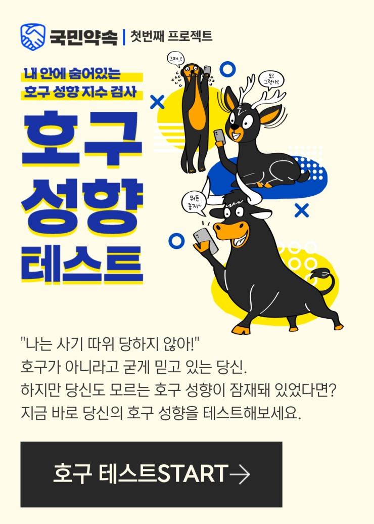 나는 과연 호갱일까 아닐까 궁금하다면 이 테스트를 해보자. 전자 문서 서명 서비스 ‘국민약속’이 만든 테스트로 내가 얼마나 줏대 있게 세상을 살아가고 있는지, 똑똑한 척은 혼자 다했지만 사실은 호구짓하고 있었는지를 여부를 알 수 있다. 가장 많이 나오는 유형은 ‘티 없이 맑은 A++흑우’로 전체의 35%를 차지하고 있다고. 생각보다 많은 사람들이 실속을 차리지 못하고 살고 있음을 알 수 있는 대목이다. 호구성향 테스트