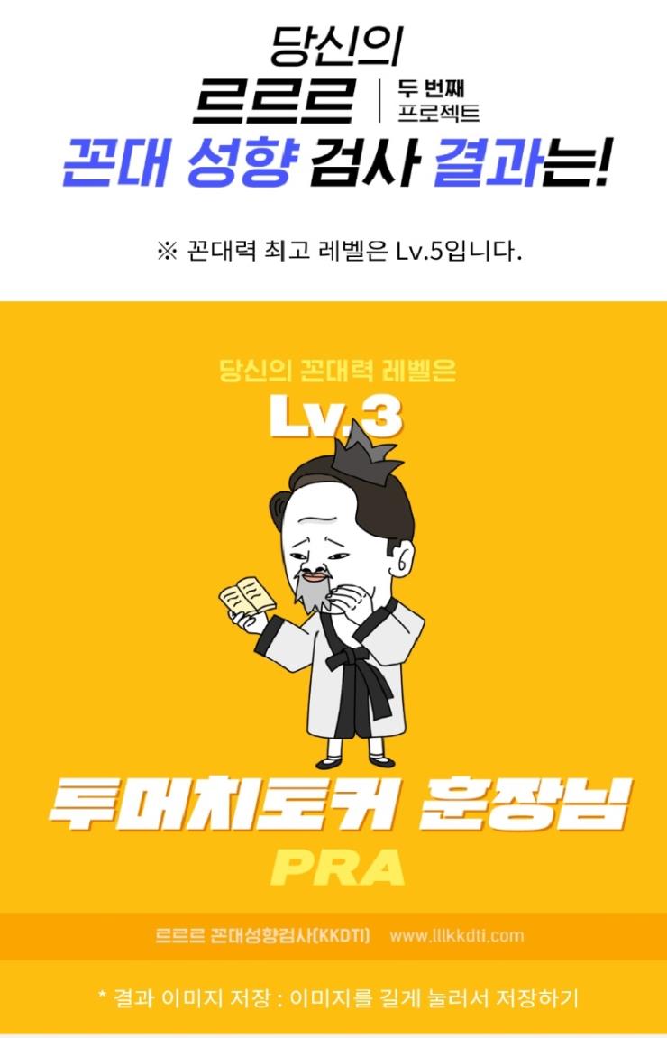 총 43가지 질문을 통해 내 안의 8가지 꼰대 유형과 지수를 알 수 있다. 직장 상사와 후배와 함께 하면 꿀잼 혹은 폭망 예상되는 테스트. 자신에게 잠재된 꼰대력은 어느 정도이고 꼰대를 탈출하고 싶다면 어떻게 해야 하는지 솔루션까지 제공해 주어 자신을 돌아보게 만든다. 르르르 꼰대성향 검사