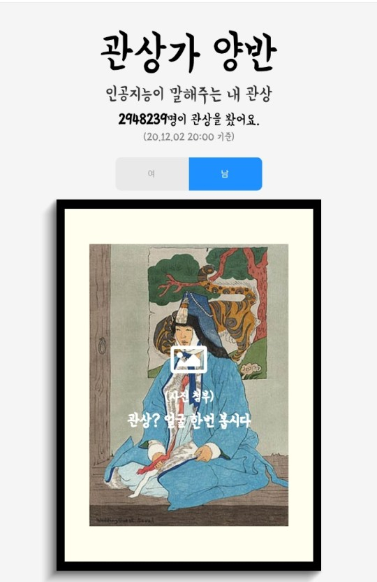 AI 관상가가 사진을 보고 내가 왕이 될 상인지 아닌지 알려주는 테스트. 연애나 결혼, 어울리는 직업, 또 나와 비슷한 상을 지닌 연예인이 누구인지도 함께 알려준다. 사진마다 다른 결과가 나온 다는 한계가 있으니 셀기꾼 같은 사진을 비롯해 여러 사진을 준비해놓고 테스트해 보도록 하자. 관상가 양반