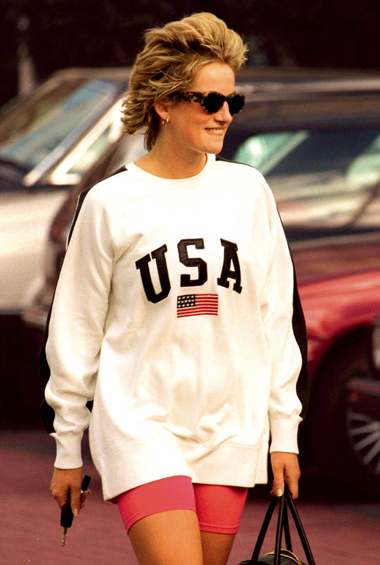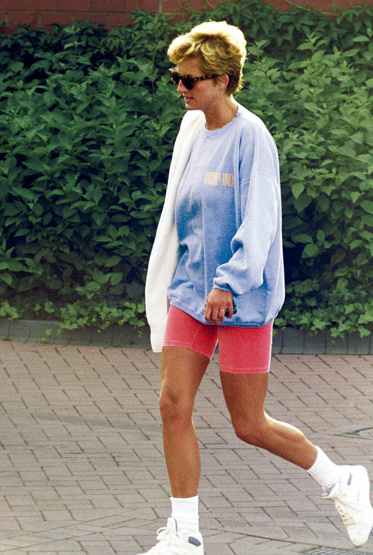 사이클링 쇼츠의 원조가 다이애나였던 것을 알고 있는지? 1980년대 후반 다이애나는 운동할 때 사이클링 쇼츠와 스웨트셔츠의 조합을 즐겼다. 컬러풀한 사이클링 쇼츠, 하이톱 스니커즈의 조합은 요즘 패션을 보는 듯하다. Cycling Shorts