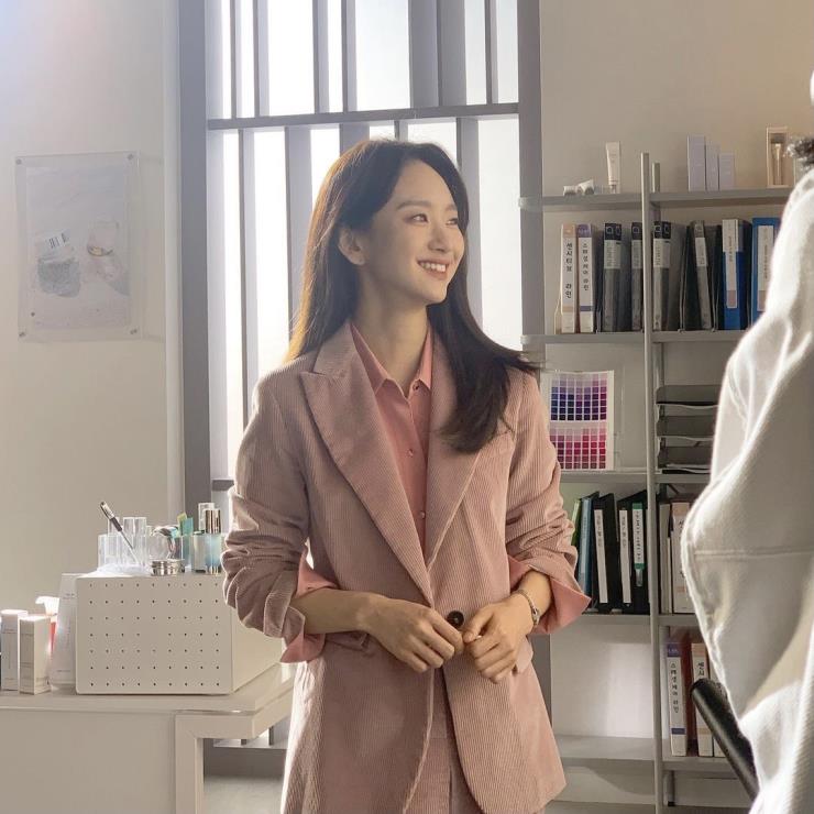 그녀가 착용했던 핑크 코듀로이 수트 셋업은 HEBE STUDIO.