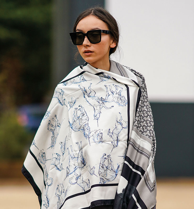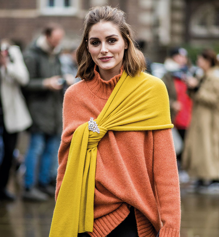 스카프를 상의에 케이프처럼 두르고 옷핀으로 고정해볼 것. 스카프의 아름다운 패턴을 모두에게 과시할 수 있을 테니! PIN IT