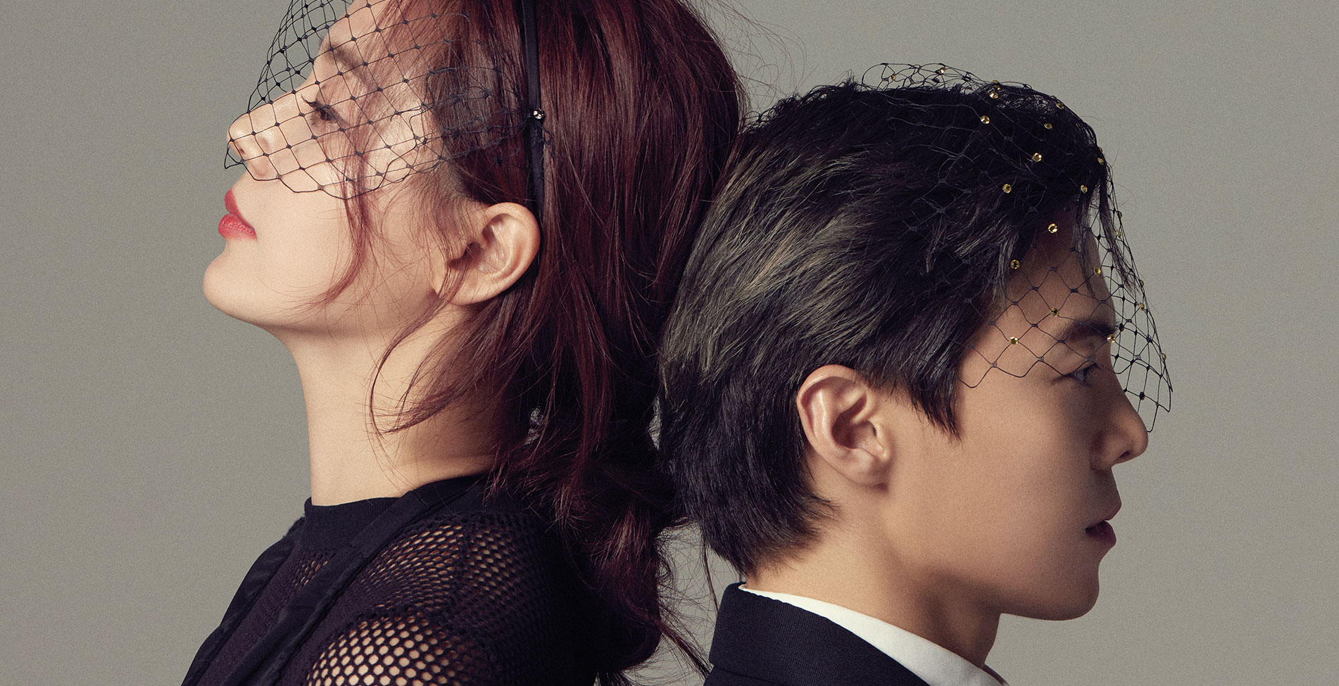 (유진)레이스 톱, 드레스 모두 가격미정 미우미우. 헤드피스 9만8천원 큐 밀리너리.(은석)재킷, 셔츠 모두 가격미정 디올 맨. 헤드피스 13만9천원 큐 밀리너리.