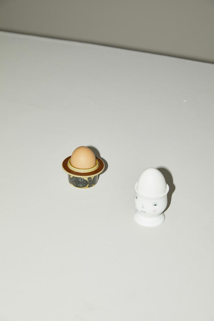 삶은 달걀은 만만하다. 삶기만 하면 되고 껍데기만 까면 그만인데 금세 배가 찬다. 그 만만함에 이끌려 일주일에 4일 정도 달걀을 삶게 되었다. 정확히 달걀 3개. 그렇게 매일 아침을 삶은 달걀로 시작하다 보니 괜한 욕심이 생기기 시작했다. 만만함은 잠시 접어 두고 근사함을 좀 더하고 싶다고. 그런 생각이 들 때쯤 영화 ‘콜미 바이 유어 네임’의 한 장면이 떠올랐다. 에그 컵에 세워둔 달걀을 스푼으로 톡톡 쳐서 안을 파먹던 장면. 같은 달걀일진데 에그 컵 안에 있던 달걀은 꽤 특별한 것처럼 보였다. 나의 달걀도 영화 속 장면처럼 근사해지길 바랐다. 그렇게 나는 하나둘씩 에그 컵을 사모으기 시작했고, 매일의 기분에 따라 끌리는 것을 골라 식탁 위에 올렸다. 때론 에스프레소잔이나 위스키잔도 에그 컵이 되었다. 달걀과 에그 컵의 사이즈가 딱 맞을 땐 그날의 운세가 잘 풀릴 징조라도 되는 듯 날아갈 것 같은 기분이기도 했다. 에그 컵 위로 매끈하게 솟은 달걀은 대머리 아저씨처럼 정겹게 느껴졌고, 호텔에서 먹는 조식인 것 같기도 했으며 무엇보다 잘 차려 먹는 느낌이 물씬 풍겼다.