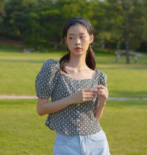 국내 브랜드 벰버(vem.ver)의 패턴 블라우스. 로제는 블랙 하의와 매치해 시크하게 소화해냈다.