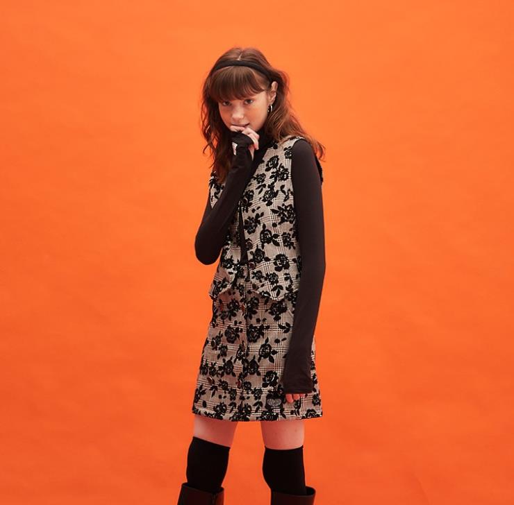 빈티지한 장미 패턴의 베스트와 스커트 세트. 로제는 셋업으로 원피스처럼 연출했다. 베스트를 데님과 매치해도 트렌디하게 스타일링할 수 있을 듯.