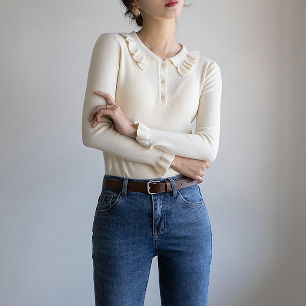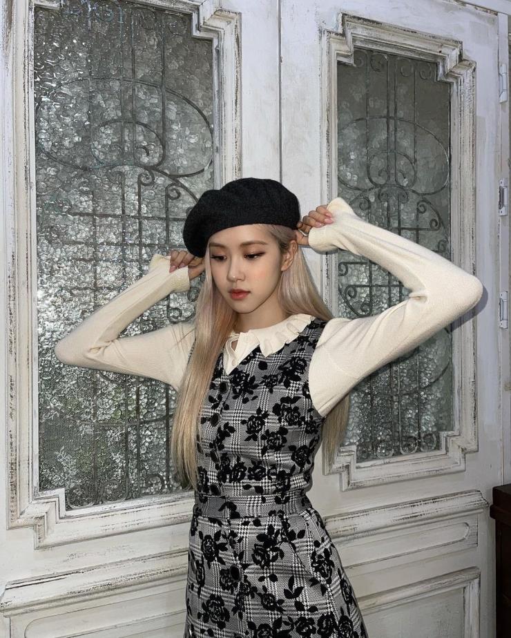 로제가 이너로 선택한 아이템은 러플 카라 니트. 평소 걸리쉬한 무드를 즐기는 로제와 어울리는 사랑스러운 아이템.