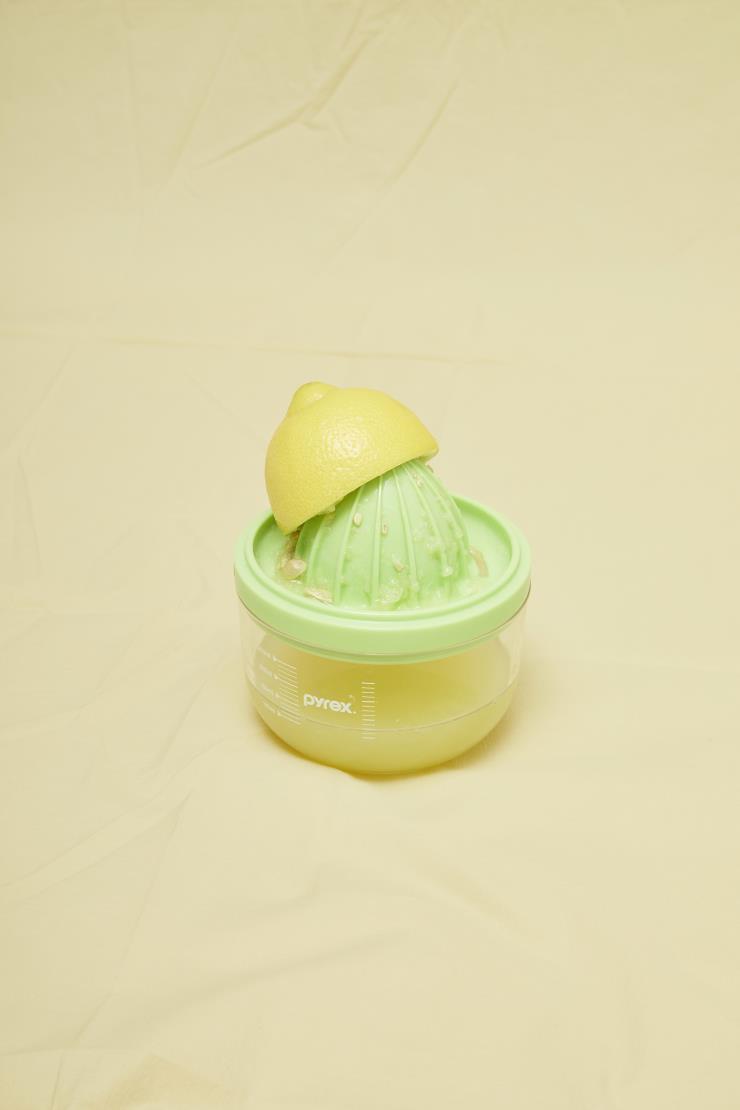 레몬을 반 가른 뒤 스퀴저에 올려 레몬즙을 짠다.