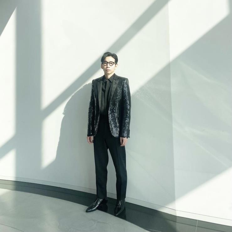 펜트하우스 2 제작발표회에서 입었던 생로랑 수트, 뿔테 안경까지 함께하니 흡사 예민한 피아니스트 같다.