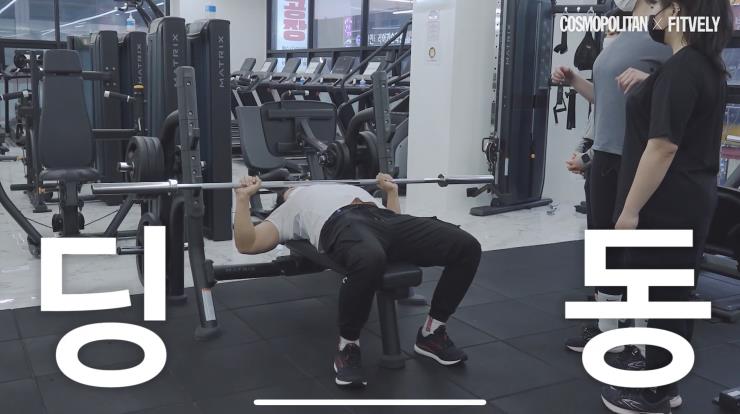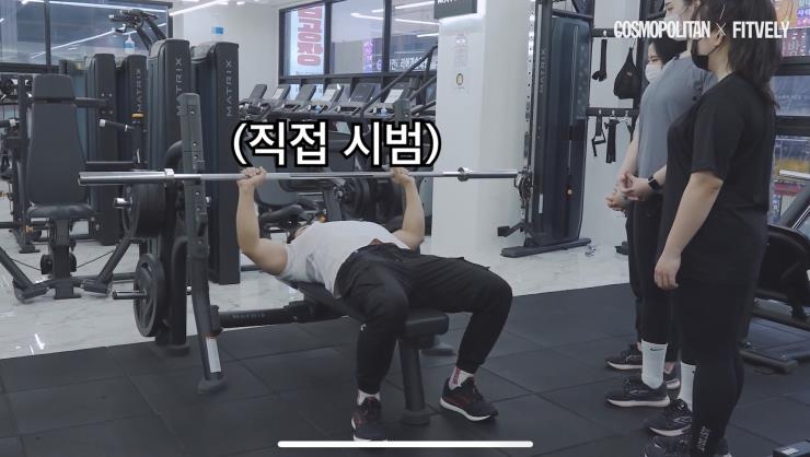 벤치 프레스의 정석 자세는 누운 상태에서 견갑을 뒤에서 더 접으면서 벤치프레스에 들어가는 것. 견갑을 먼저 접으면서 기구를 들어 주고, 내릴 땐 천천히 명치 있는 곳까지 내려줘야 벤치 프레스의 효과를 높일 수 있다! Step 3. 벤치 프레스