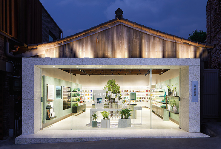 매장에 수거함을 비치하고 고객들로부터 다 쓴 용기를 모아 다양한 재활용 제품을 만드는 것에 그쳤다면 감히 ‘에코 지존’ 이니스프리라 부를 수 없을 터. 공병 수거에 매우 진심인 이니스프리는 지난 2017년 매장에서 모은 공병을 재활용하고, 이를 사용해 한옥 두 채를 리모델링하는 넘사벽 프로젝트를 실시했다. 이것이 바로 삼청동의 핫 플레이스, ‘공병공간(空甁空間)’. 인싸라면 한 번쯤 방문했을 이곳은 바닥과 벽면, 가구 등 매장 내외부 공간의 70%가 화장품 용기를 분쇄해 얻은 자재로 만들어졌다는 어메이징한 사실! 그러니 매장에 빈 병 꽤나 갖다 버린 나에게도 이곳의 지분 0.001%쯤은 있다는 게 빼박캔트다.