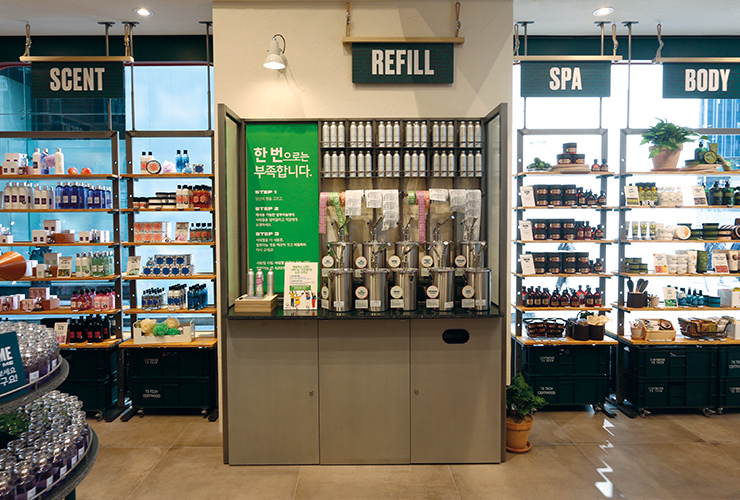 입점 브랜드 43개, 체험 및 구매 가능한 제품은 무려 2300여 개! 범접할 수 없는 저 세상 스케일로 위풍당당하게 등장한 에코 숍계의 레전드. 국내 화장품업계 최초로 샴푸와 보디 워시의 내용물만 소분해 판매하는 리필 스테이션도 운영 중이다. 15가지 아이템 가운데 원하는 제품을 원하는 만큼 리필 용기에 충전해 구입하는 방식인데, 1년 365일 정품 대비 초할인가로 구입할 수 있어 핵꿀. 제조된 지 100일 이내의 제품 판매를 원칙으로 하며, 북유럽 감성 돋는 코코넛 껍질 소재의 리필 용기는 리필 직전 다시 한번 자외선 LED 램프를 통해 완벽 살균 처리를 거치기 때문에 신선하고, 안전하다는 것 또한 특징이다.