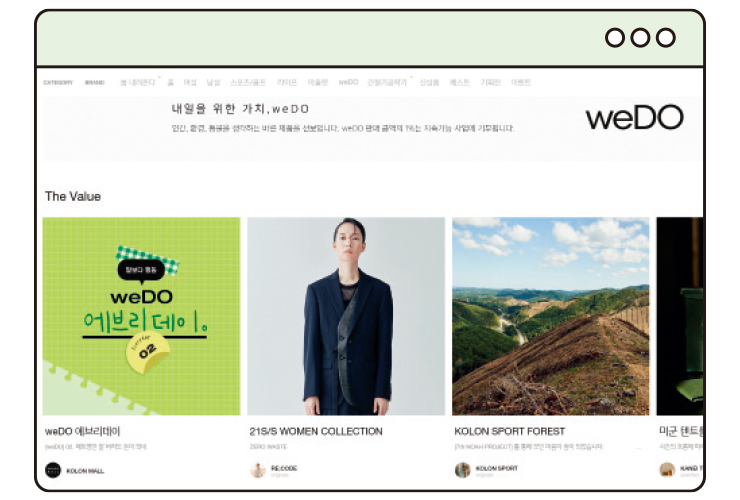 패션·뷰티·라이프스타일 제품을 모두 만날 수 있는 코오롱몰의 지속 가능성 플랫폼으로 판매 금액의 1%를 기부한다. 제품 판매를 넘어 친환경 브랜드를 찾아내고, 브랜드의 친환경 프로젝트까지 함께 소개한다.