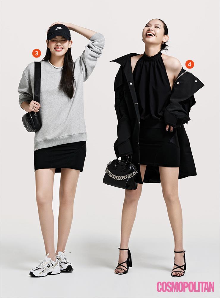 이번 시즌의 또 다른 트렌드 아이템 스웨트셔츠는 뛰어난 범용성을 자랑한다. 이는 미니스커트와의 매치에서도 마찬가지. 볼캡과 스니커즈, 진주 목걸이만 있다면 동시대적인 캐주얼 룩이 완성된다.
