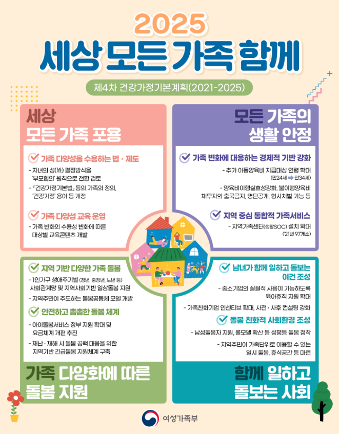 정영애 여성가족부 장관 역시 제4차 건강가정기본계획을 발표하며 “모든 가족들이 차별받지 않고 함께 인권이 존중되고 보호받을 수 있도록 사회적 공감대를 지속적으로 확산 시켜 나가고자 하는 것입니다.”라고 덧붙였습니다. 올해부터 적용될 건강가정기본계획을 통해 어떤 변화가 있을지 귀추를 주목해볼 만하며, 다양한 형태의 ‘가족’이 형성돼 조금 더 따뜻한 사회가 펼쳐지길 기대해봅니다.